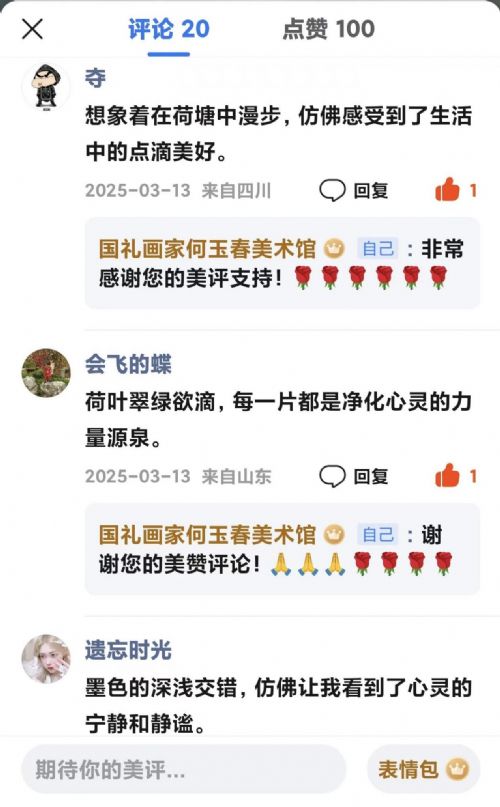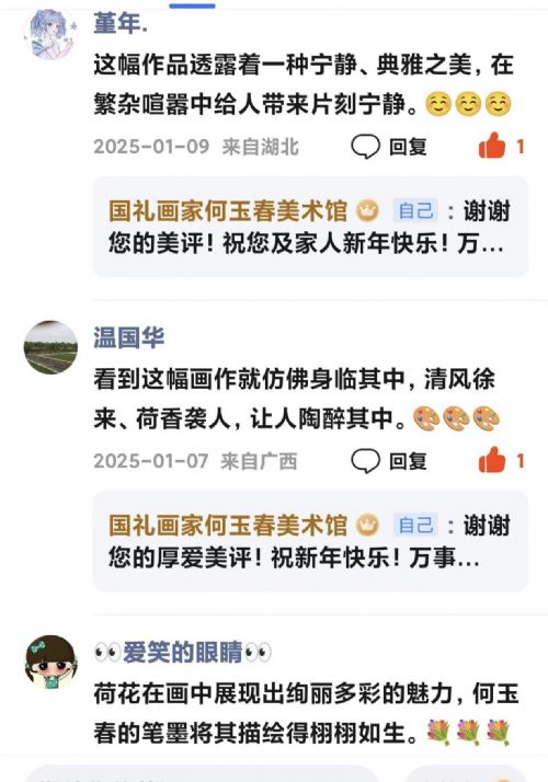 从评论区的专业视角看,何玉春的艺术魅力体现在三个维度:其一,技法之妙——“细腻入微的层次感”(《胡琼》评)与“恰到好处的色彩搭配”(《得就德》评),展现了扎实的传统功底;其二,意境之深——“每一笔都彰显艺术魅力”(《super@雪》评),在“写意”中融入诗性,让画面“如散发淡淡香气般吸引眼球”(《hhf》评);其三,精神之核——以荷花为载体,传递“心如莲花”的纯净力量,正如“老东西”所言,让人“忘却尘世俗事”,在艺术中找到心灵的栖息地。